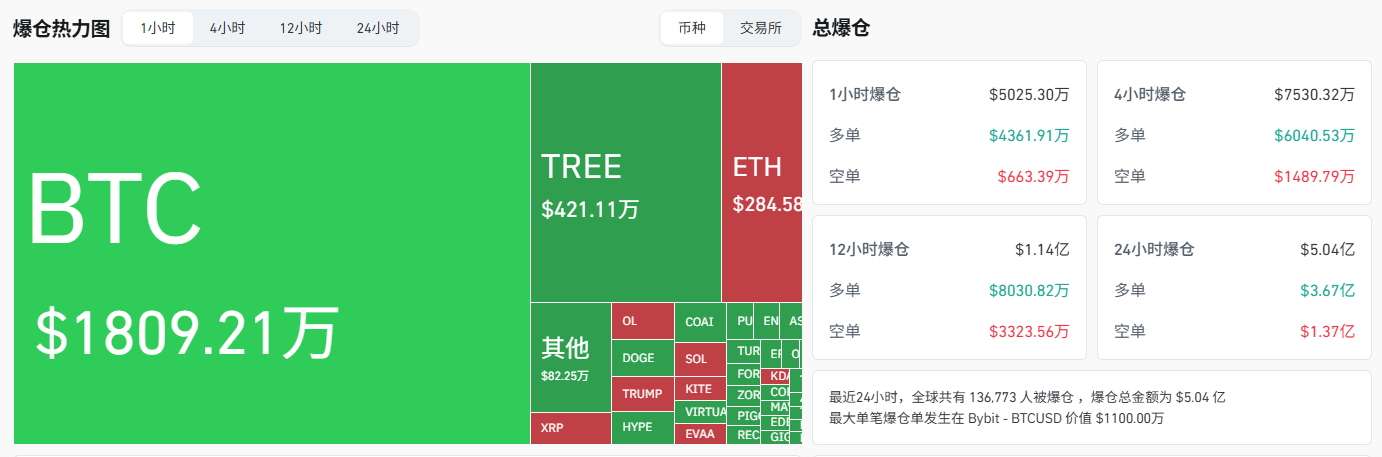 Coinglass의 데이터에 따르면, Odaily Planet Daily는 지난 1시간 동안 네트워크 전체에서 5,025만 3,000달러 상당의 포지션이 청산되었으며, 이 중 롱 포지션이 4,361만 9,100달러, 숏 포지션이 663만 3,900달러라고 보고했습니다.