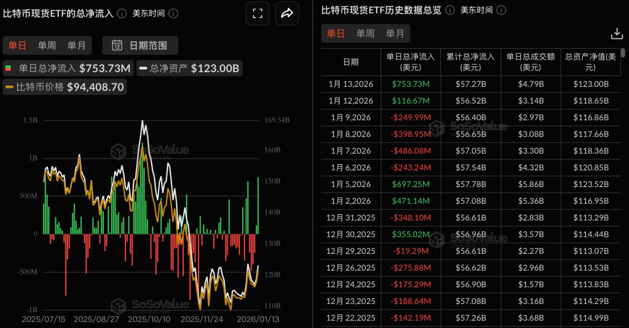 Odaily 소식 SoSoValue 데이터에 따르면, 어제(미 동부 시간 1월 13일) 비트코인 현물 ETF의 총 순유입액은 7.54억 달러였다.