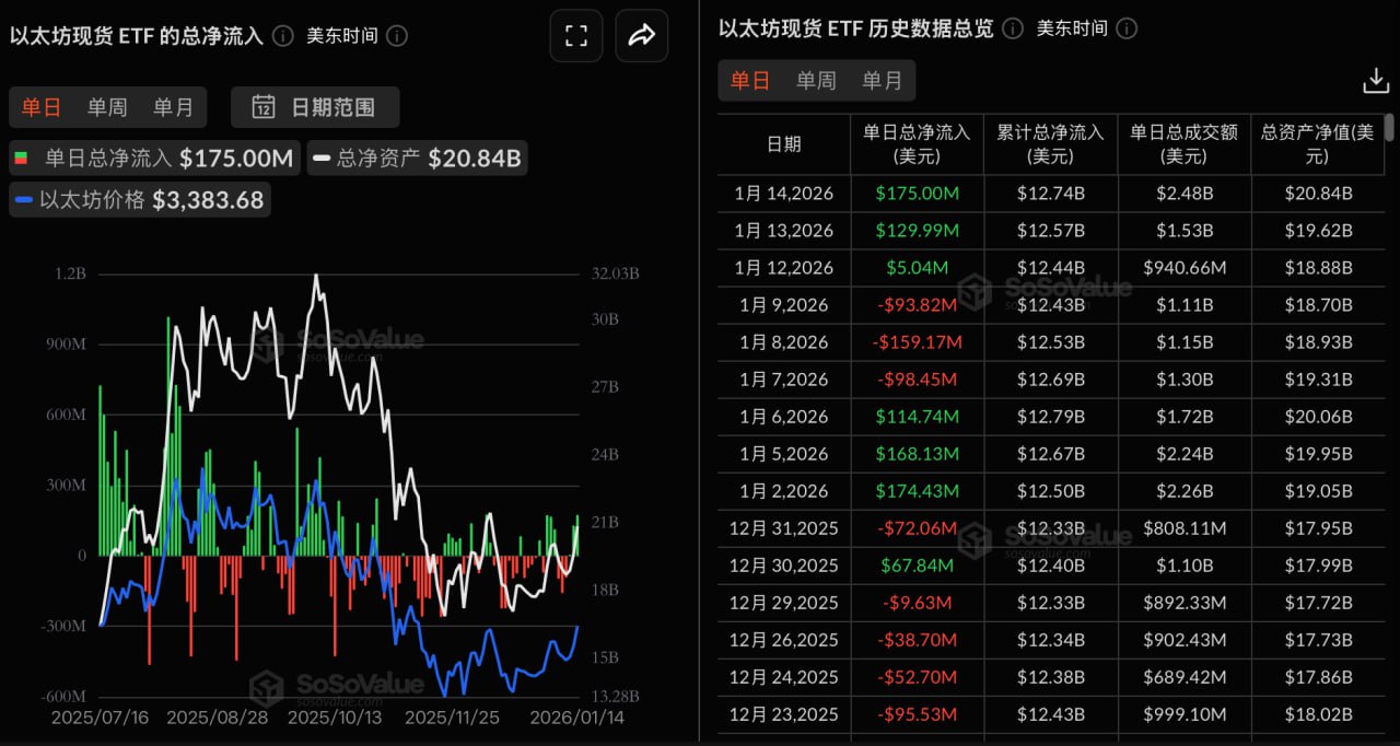 Odaily 소식 SoSoValue 데이터에 따르면, 어제(미 동부 시간 1월 14일) 이더리움 현물 ETF 총 순유입액은 1억 7500만 달러였다.