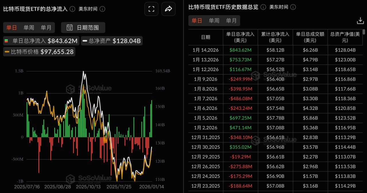 Odaily에 따르면 SoSoValue 데이터를 인용한 보도에 따르면, 어제(미 동부 시간 1월 14일) 비트코인 현물 ETF의 총 순유입액은 8억 4400만 달러였다.