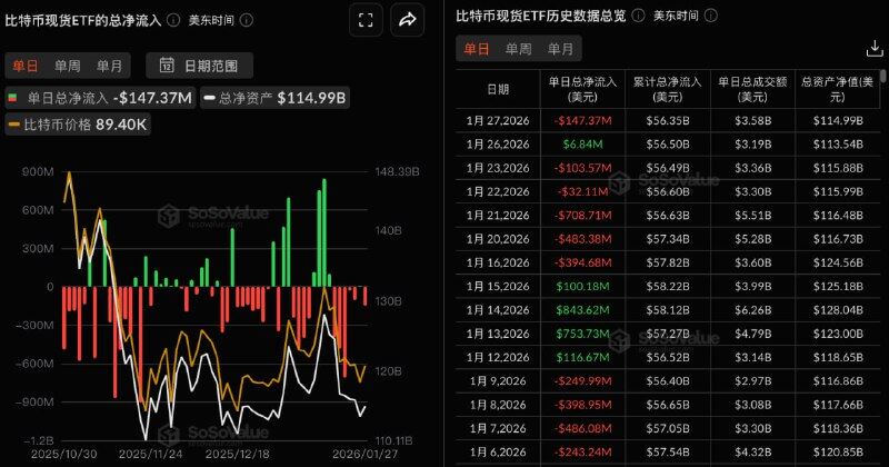 Odaily 소식 SoSoValue 데이터에 따르면, 어제(미 동부 시간 1월 27일) 비트코인 현물 ETF의 총 순유출액은 1억 4700만 달러였습니다.