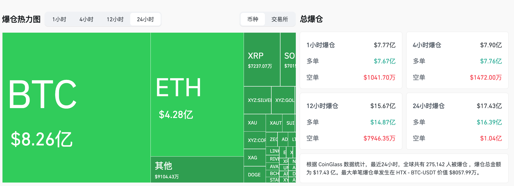 Odaily 소식 Coinglass 데이터에 따르면, 지난 1시간 동안 전망에서 7억 7,700만 달러가 청산되었으며, 그중 롱 포지션 청산액은 7억 6,600만 달러입니다. 최근 24시간 동안 전 세계적으로 총 275,142명이 청산을 당했으며, 청산 총액은 17억 4,300만 달러입니다. 최대 단일 청산 주문은 HTX의 BTC-USDT 거래 쌍에서 발생했으며, 그 가치는 8,057.99만 달러입니다.