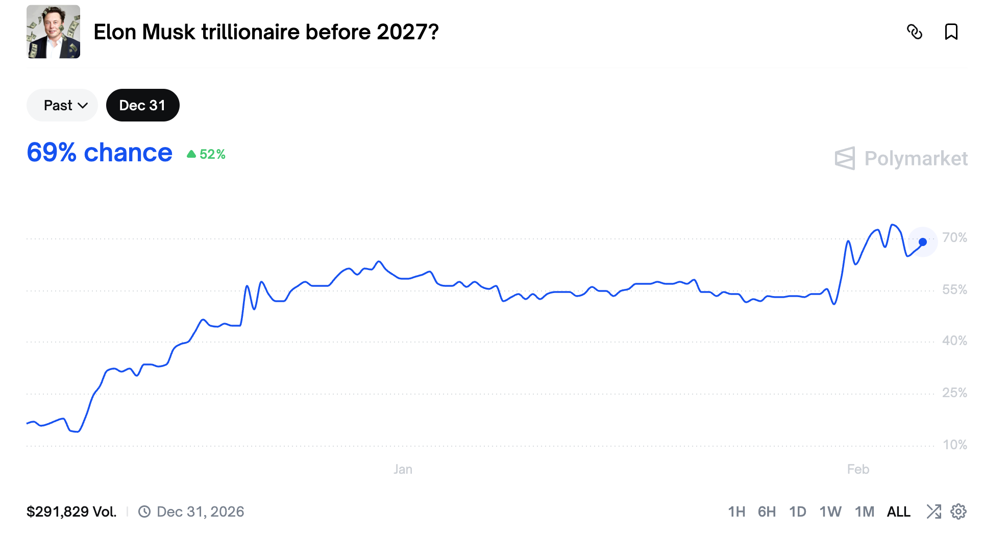 Polymarket에서 '머스크가 2027년 이전에 억만장자가 된다'는 사건 확률이 69%로 상승