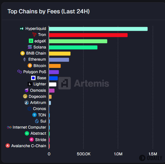 Odaily 보도에 따르면, Artemis 데이터는 Hyperliquid의 24시간 수수료 수익이 140만 달러로 1위를 차지했으며, 그 뒤를 Tron과 EdgeX가 따르고 있음을 보여줍니다.