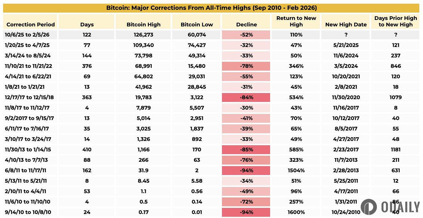 Odaily 소식 Binance Research가 X 플랫폼에 게시한 글에 따르면, 2025년 10월 사상 최고치 이후 50% 하락은 이전 사이클에 비해 온화한 조정을 나타내며, 시장이 성숙됨에 따라 변동성이 감소했음을 반영한다.