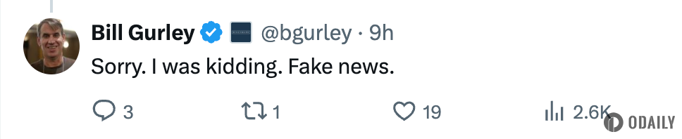 Odaily 소식 이전에 '아일린 구가 선임 투자 매니저로 벤치마크에 합류한다'는 소식에 대해, 벤치마크 투자자 빌 걸리가 답변하며 "죄송합니다, 농담이었어요. 이는 허위 정보입니다."라고 밝혔습니다.