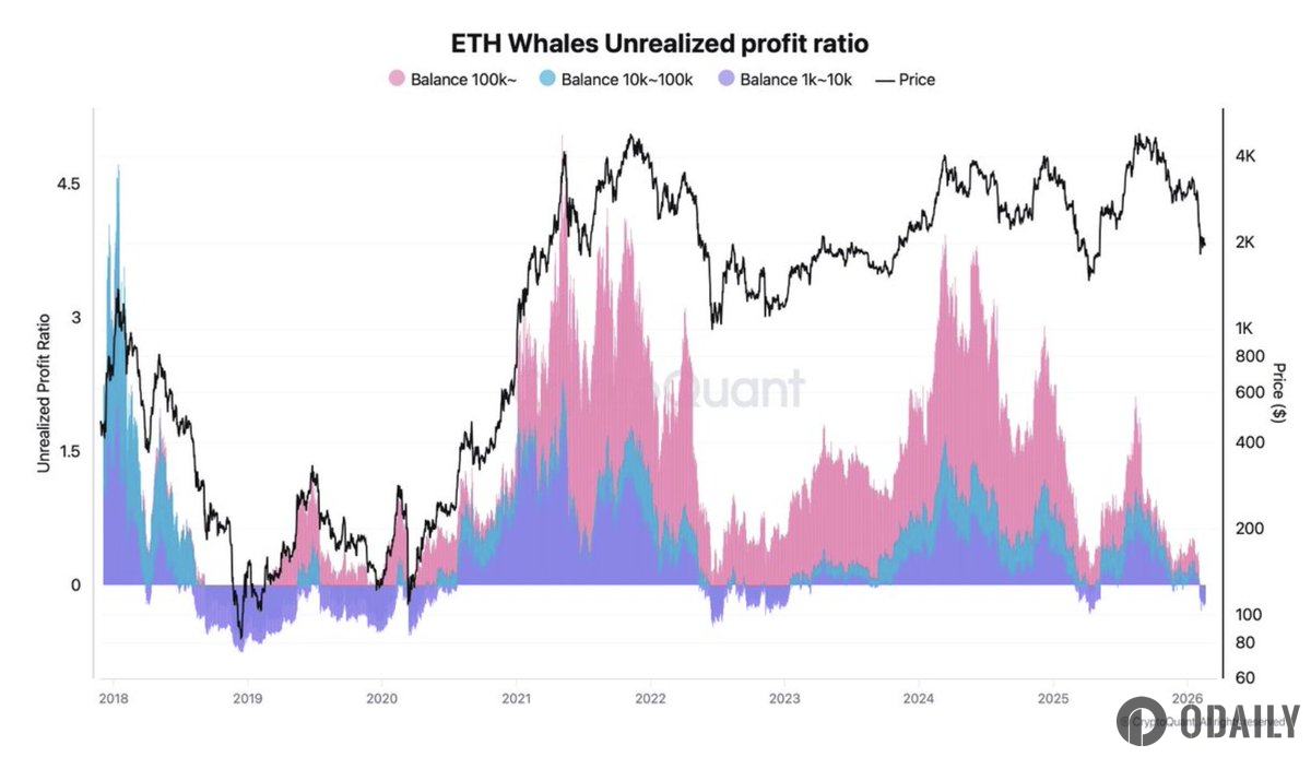 Odaily 보도에 따르면 Coin Bureau가 인용한 데이터에 의하면, 모든 등급의 ETH 고래들(10만 개 이상 보유, 1만 개에서 10만 개 보유, 1000개에서 1만 개 보유의 세 등급으로 구분)이 현재 전면적으로 '수중'(평가손실) 상태에 놓여 있다.