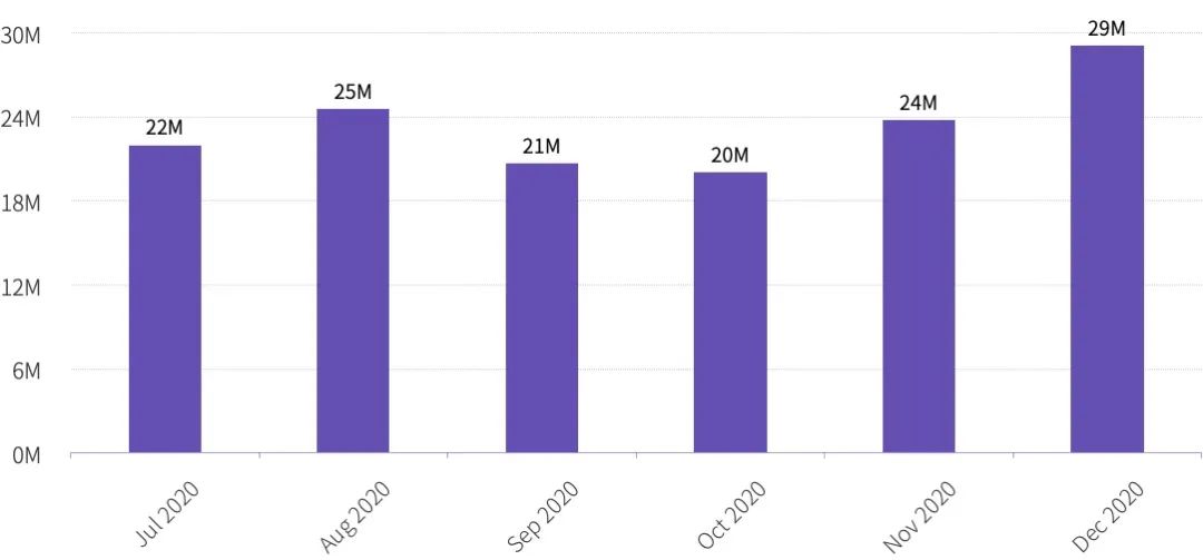 2. TokenInsight가 집계한 상위 10개 디지털 자산 지갑 중 2020년 총 방문자 수는 1억 4천만 명에 이를 것입니다. 2020년 하반기에만 방문객이 7월 2,200만 명에서 12월 거의 3,000만 명으로 무려 32%나 증가했습니다.