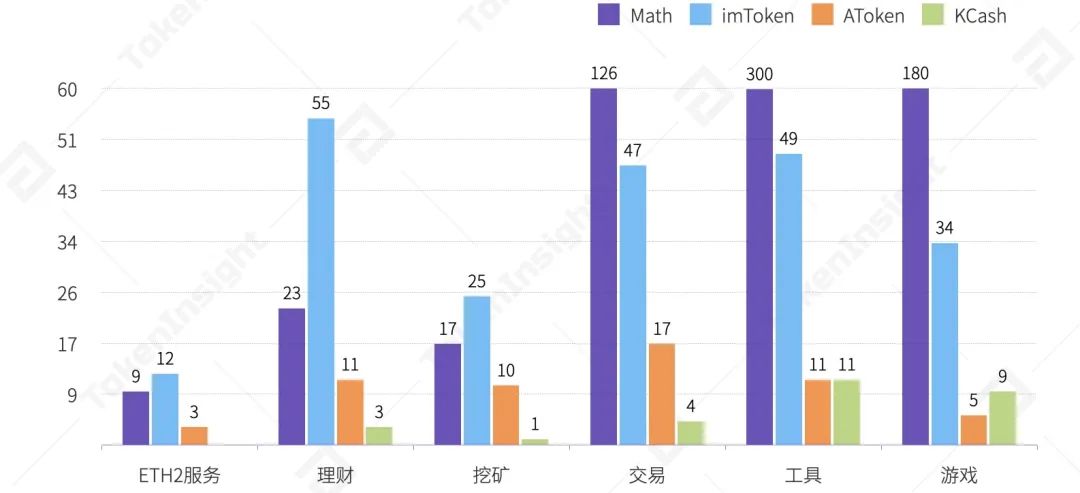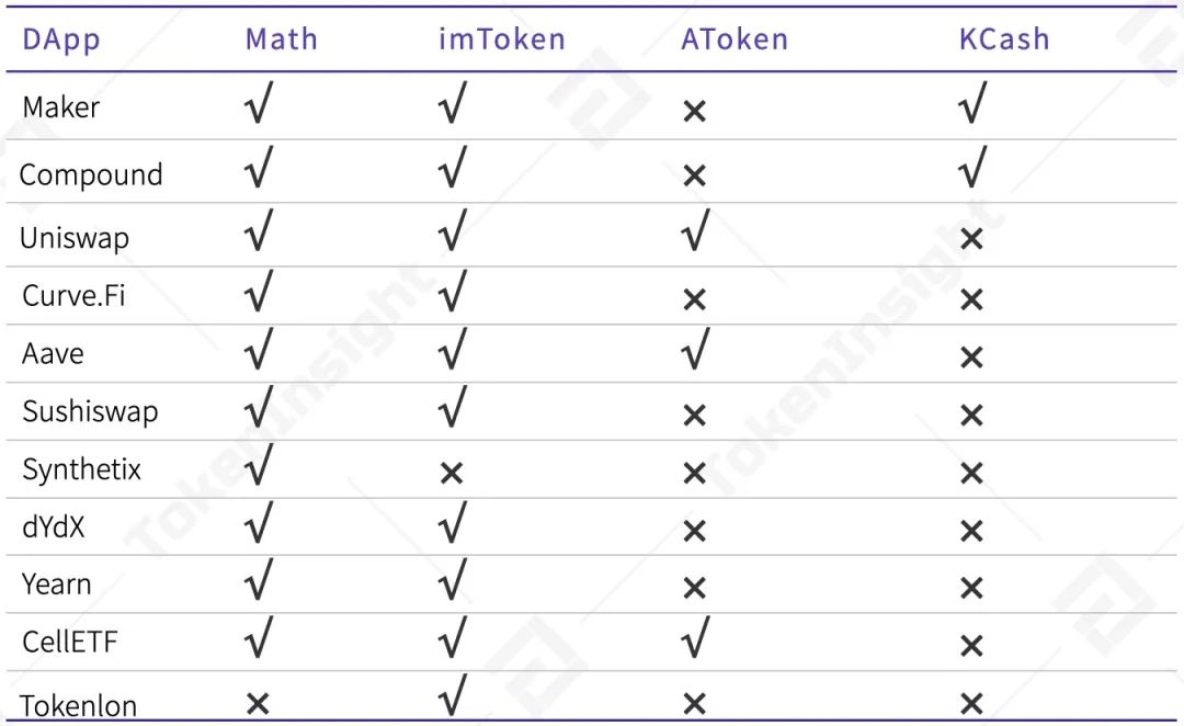 TokenInsight는 아래 그림과 같이 Math Wallet, imToken, AToken 및 Kcash 지갑의 DApp 브라우저를 비교하고 DApp의 도킹 데이터를 집계했습니다.