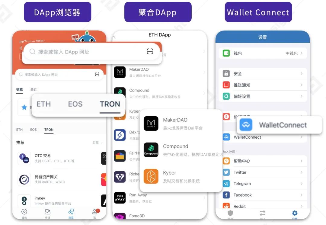 세 가지 DApp 액세스 방법 표시, 소스: imToken, KCash, Trust Wallet, TokenInsight