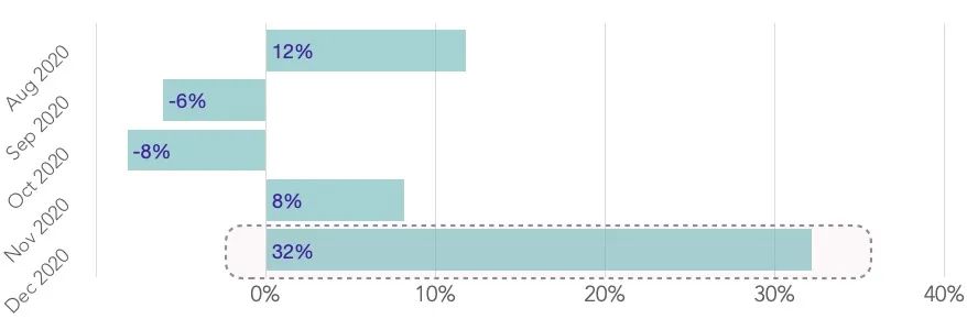 그 중 9월과 10월에는 약간의 마이너스 성장이 있었지만, 시장 열기가 꾸준히 회복되면서 12월 지갑 앱 방문수도 32% 성장을 달성했습니다.