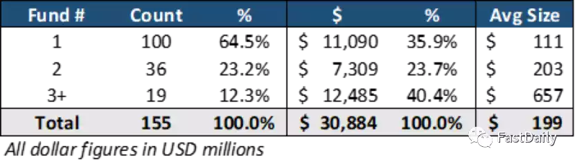 산업은 그 어느 때보다 양극화되어 있습니다. 33개 펀드는 평균 펀드 규모가 7억 1,300만 달러이며 자본금의 76%를 통제합니다. 나머지 122개 펀드가 나머지 24%를 관리하며 평균 펀드 규모는 6천만 달러입니다.
