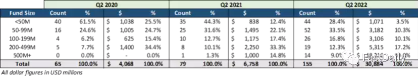 이러한 크고 작은 펀드의 분할에도 불구하고 2억 달러 미만의 122개 펀드는 여전히 1년 전 업계 전체보다 9% 더 많은 자본을 통제하고 있습니다.