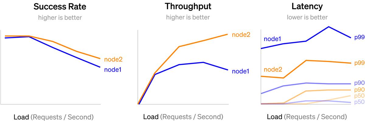 부하 테스트는 다양한 워크로드에 노출될 때 시스템의 성능 특성 변화를 측정하는 것을 말합니다. 이 접근 방식의 핵심 통찰력은 처리량, 대기 시간 및 오류율과 같은 성능 메트릭이 일반적으로 시스템 부하가 증가할 때 저하된다는 것입니다. 따라서 서로 다른 제어 부하에서 시스템이 어떻게 작동하는지 관찰하면 시스템 병목 현상, 장애 모드 및 궁극적인 성능 기능과 같은 정보를 파악할 수 있습니다.