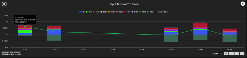 다음날과 주말 이후 전체 거래량은 감소했지만 GBTC는 여전히 지배적이었습니다.1월 16일 이후 총 거래량은 일일 약 2억 달러로 안정되었으며, ETF 전체의 거래량 분포는 1월 12일과 유사했습니다.1월 19일까지 총 거래량이 소폭 증가했습니다. 그레이스케일의 GBTC는 일일 거래량의 약 절반을 차지합니다.
