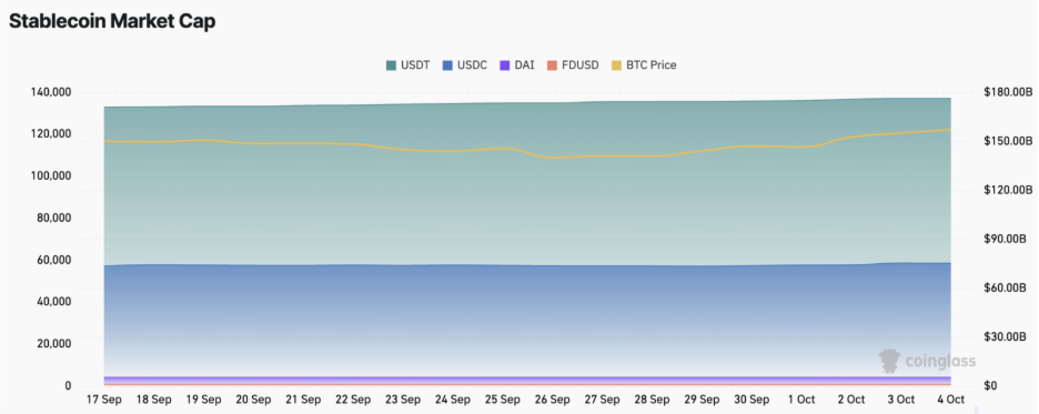 10월 6일 기준 비트코인의 시가총액은 2조 4,500억 달러로 전체 암호화폐 시가총액의 54.9%를 차지했습니다. 한편, 스테이블코인의 시가총액은 2,987억 달러로 전체 암호화폐 시가총액의 6.69%를 차지했습니다.