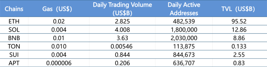 주요 분석은 일일 거래량, 일일 활성 주소, 그리고 거래 수수료를 기반으로 합니다. 현재 주요 레이어 1 데이터에는 ETH, SOL, BNB, TON, SUI, 그리고 APTOS가 포함됩니다.