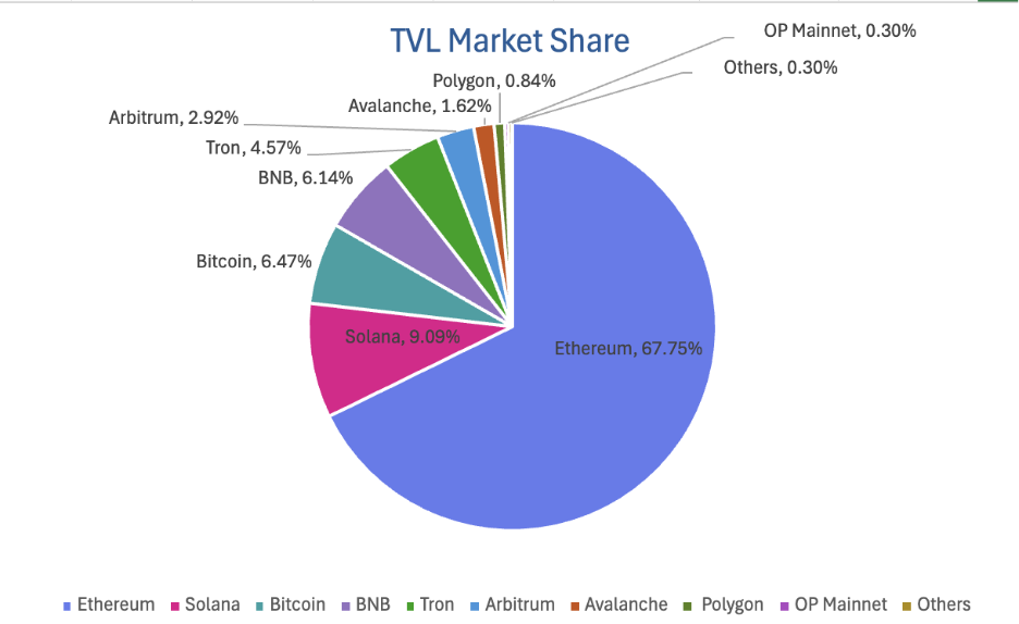 퍼블릭 체인별로 볼 때, TVL이 가장 높은 3개 퍼블릭 체인은 이더리움(67.75%), 솔라나(9.09%), 비트코인(6.47%)입니다.