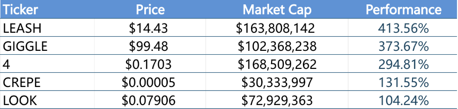 지난주 가장 많은 수익을 올린 상위 5개 밈 코인