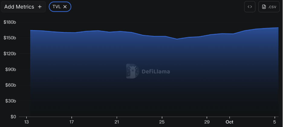 DeFiLlama의 데이터에 따르면, 이번 주 DeFi의 총 TVL은 1,691억 달러로, 지난주 1,555억 달러에 비해 약 8.74% 증가했습니다.