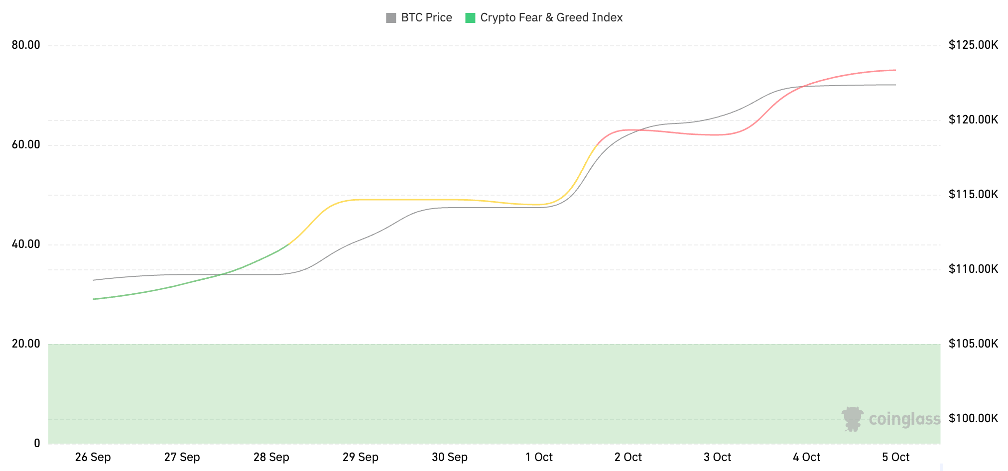 암호화폐 공포 지수는 75로 탐욕을 나타냅니다.