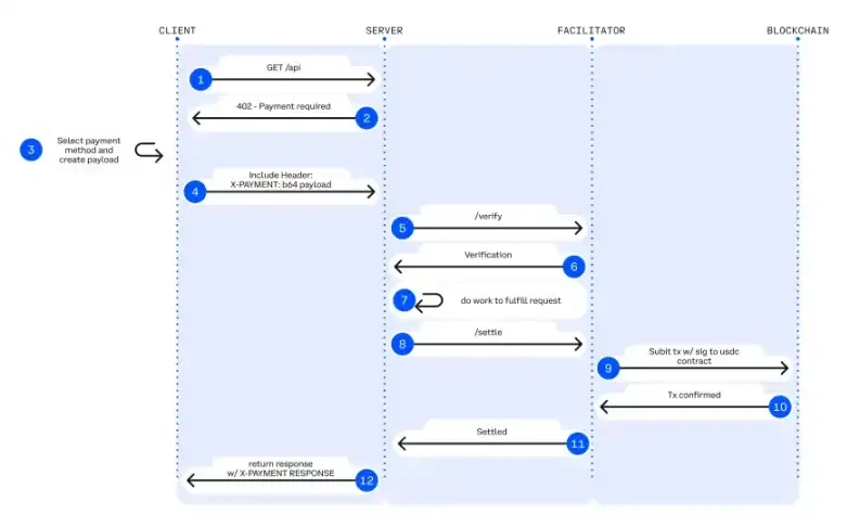 HTTP 402는 "결제 필요"를 나타내는 네트워크 상태 코드이지만, 실제로는 오랫동안 거의 사용되지 않았습니다. x402 프로토콜은 이 상태 코드를 활용합니다. AI 에이전트가 API 요청을 보내면 서버는 "계속하려면 결제가 필요합니다"라는 메시지와 함께 HTTP 402 상태 코드를 반환합니다. AI 에이전트는 이 메시지를 인식하고 해당 수수료를 스테이블코인으로 자동 지불합니다. 구체적인 절차는 다음과 같습니다.