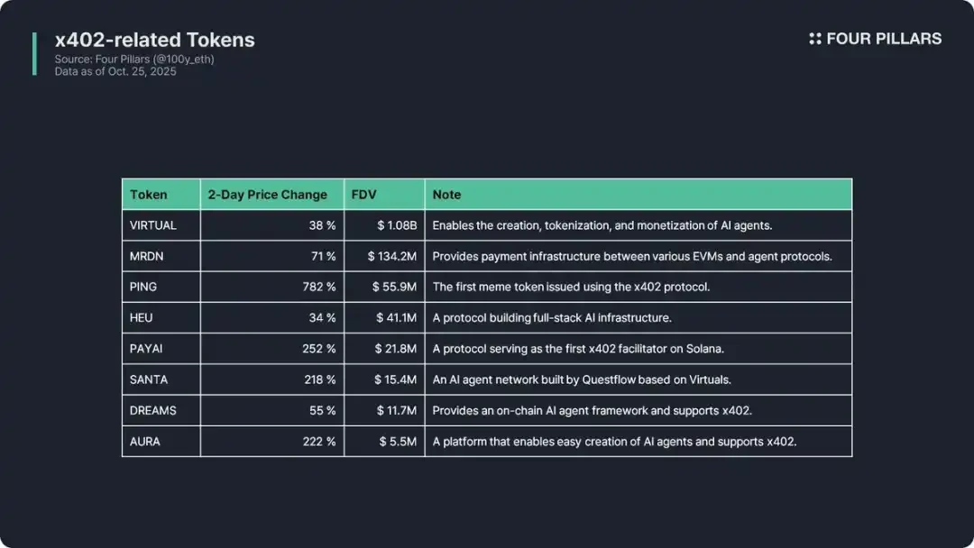 x402가 과대광고 단계에 접어들었다는 가장 직접적인 신호는 관련 토큰 가격 급등입니다. 예를 들어, "AI 에이전트" 개념의 부상과 함께 상승하는 경향이 있는 $VIRTUAL 토큰은 단 이틀 만에 40% 상승했습니다. 아래 차트에서 볼 수 있듯이 다른 관련 토큰들도 상당한 상승세를 보였습니다.