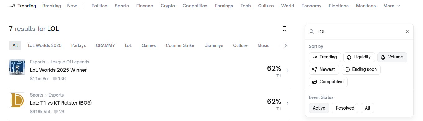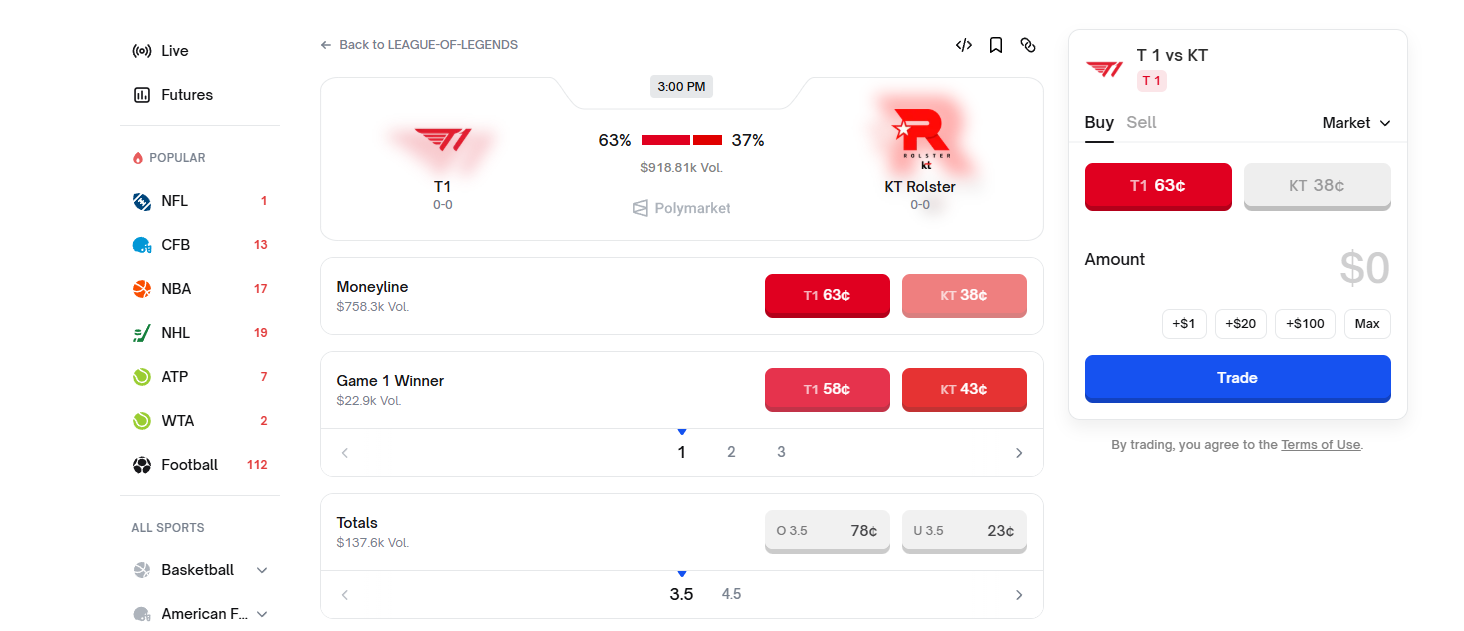 2단계. KYC 인증을 통과하고 자금을 입금한 후 검색창에 LOL을 입력하여 BO5 우승자(현재 T1의 승률은 65%) 또는 단일 게임 우승자(현재 T1의 승률은 61%)에 베팅하세요.
