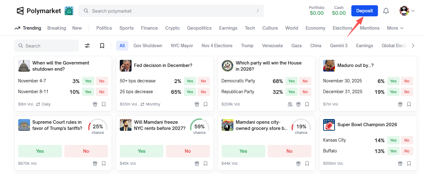 2단계. 계정에 로그인한 후 "입금"을 클릭하여 계정에 금액을 충전하고 충전 방법을 선택하세요(여러 네트워크 지원).