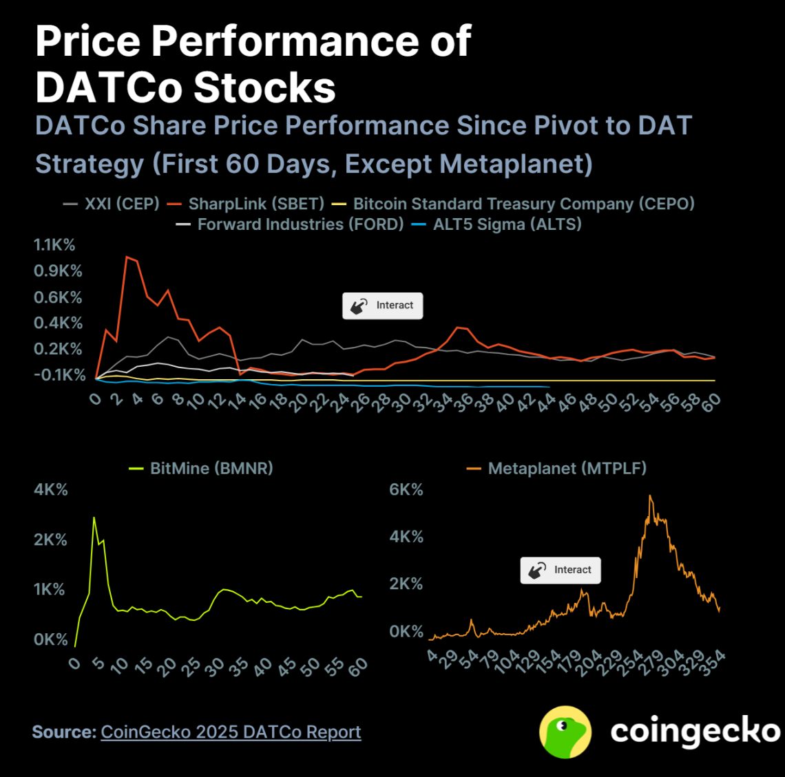 - DATCo 주가는 처음 10일 동안 급등했습니다(예를 들어, BitMine은 3,069% 상승). 그 후 전반적으로 하락했습니다.