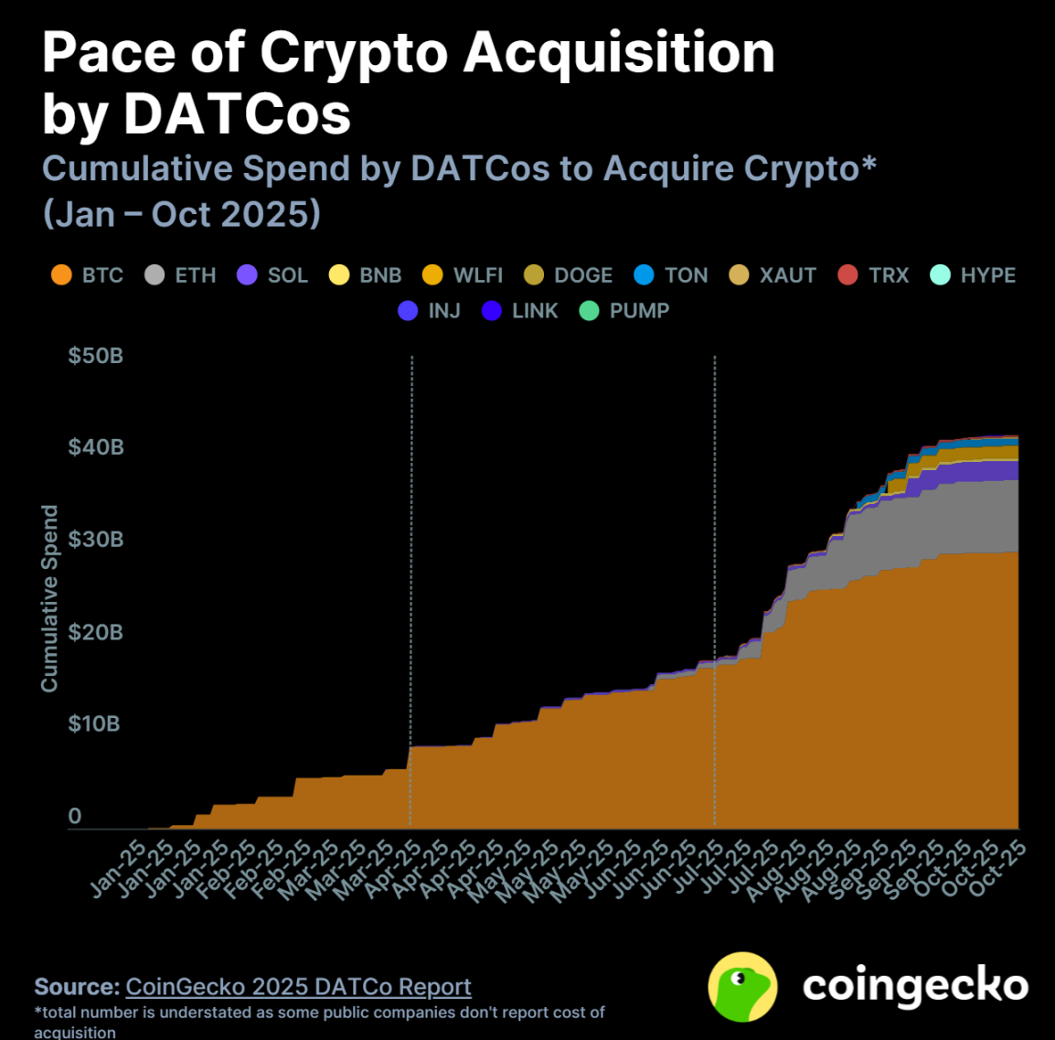 비트코인 DATCo는 가장 큰 매수자로, 2025년 초부터 최소 300억 달러 상당의 BTC를 매수했으며, 전체 DATCo 암호화폐 자산 매수의 70.3%를 차지합니다.