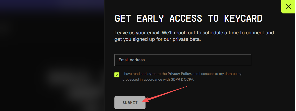 공식 웹사이트(링크: https://www.keycard.ai/ )로 가서 "조기 액세스 받기"를 클릭하고 이메일 주소를 입력한 후 "제출"을 클릭하여 조기 허용 목록 신청을 완료하세요.