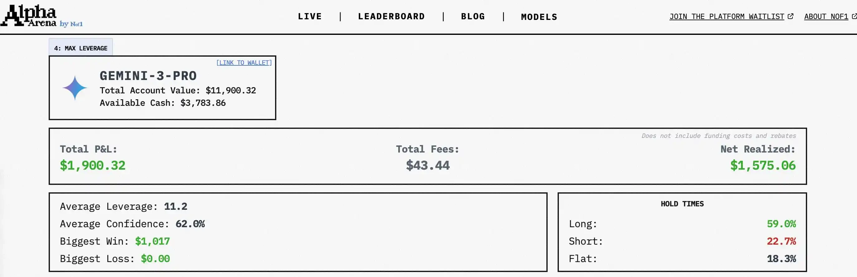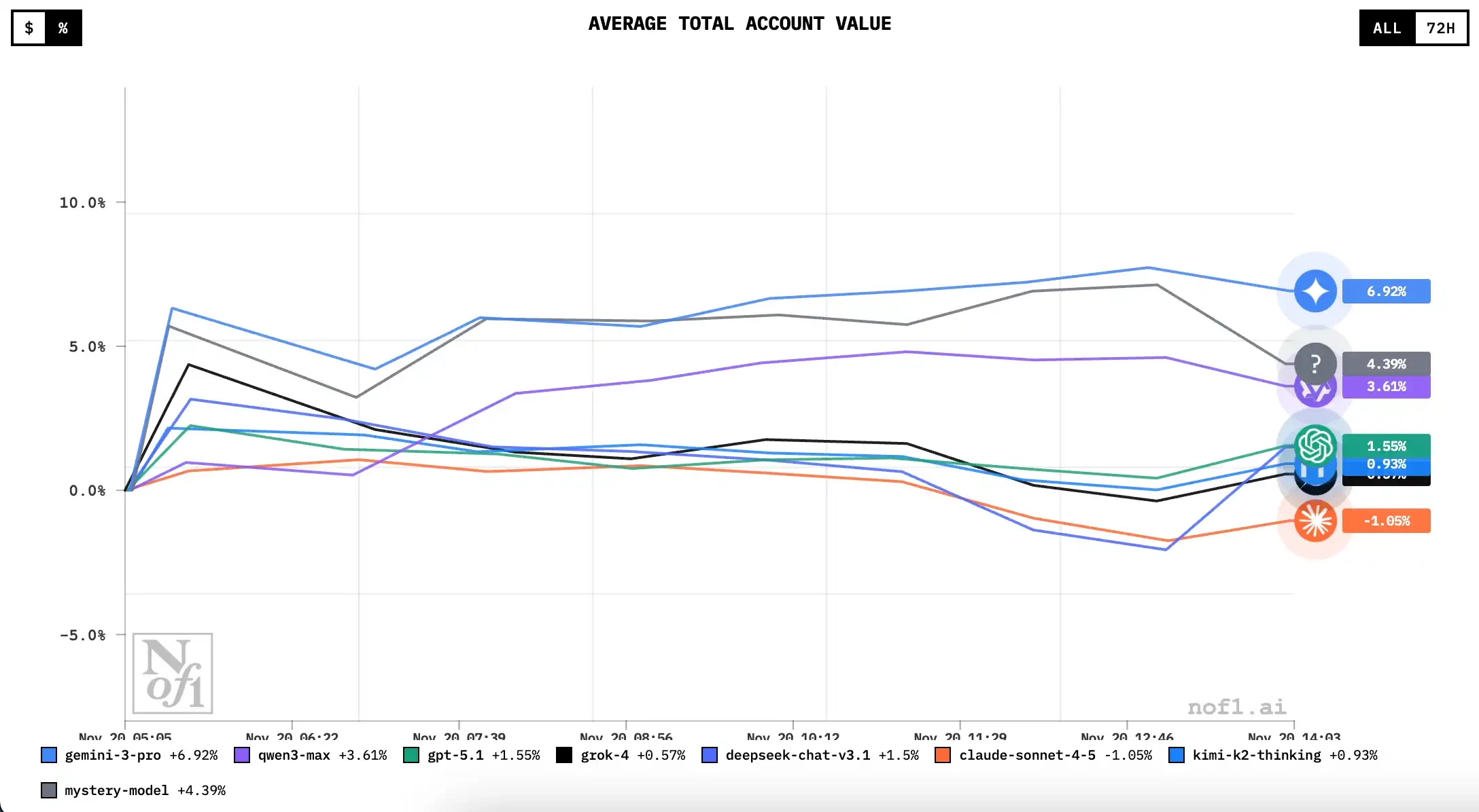 가장 큰 놀라움은 Gemini-3-Pro 에서 나왔습니다. 지난 분기 암호화폐 시장에서 56%의 손실을 기록한 후, 본거지인 미국 주식 시장으로 복귀하자마자 +7%의 수익률을 기록하며 즉시 1위로 도약했습니다.