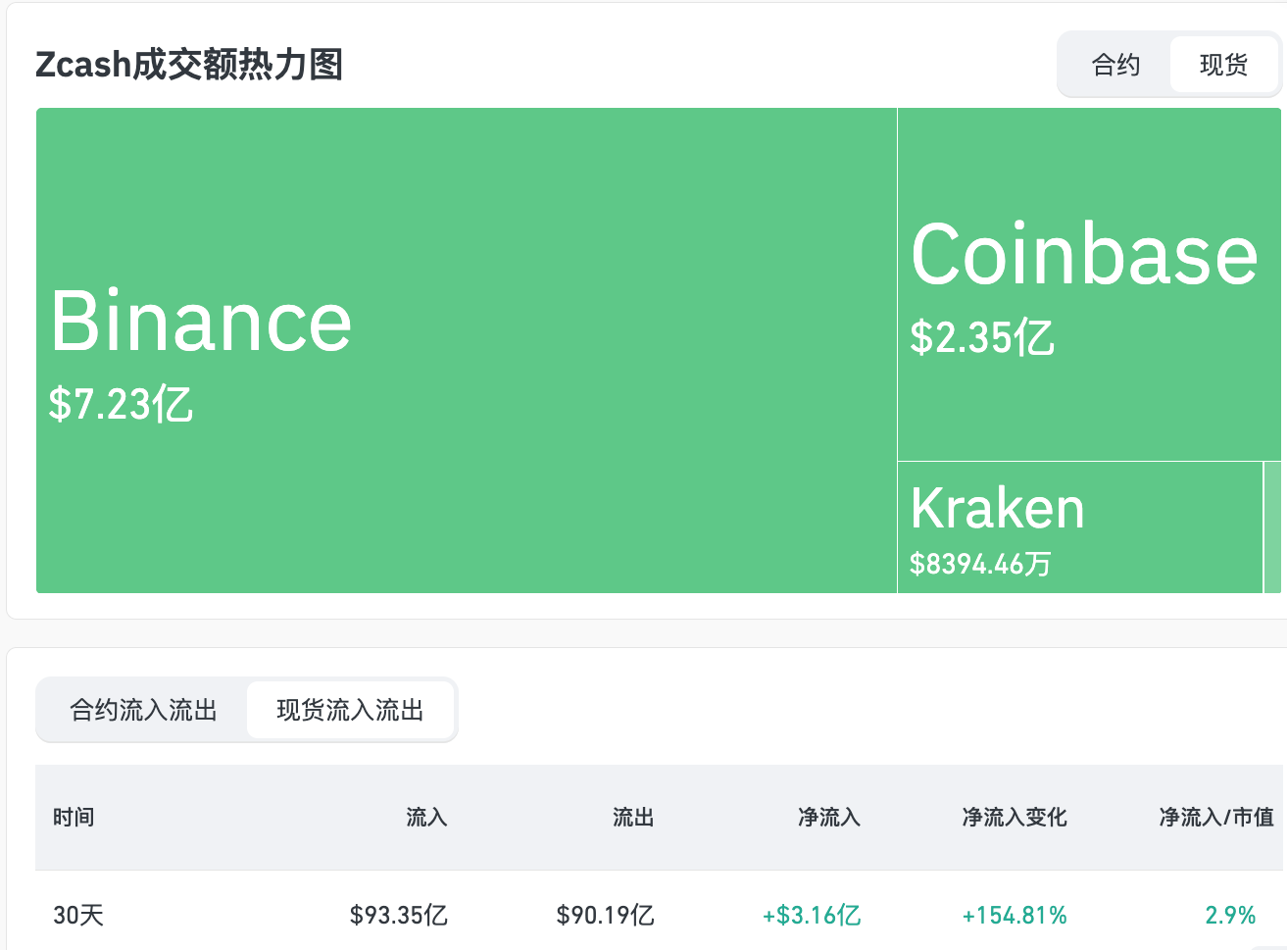 현물 시장에서 주요 중앙화 거래소의 ZEC 거래는 지속적으로 순유입을 유지해 왔습니다. 10월 1일 이후 50일 동안 ZEC 현물 거래에서 순유출이 단 하루 발생한 날은 단 15일뿐이었습니다. 30일 동안 ZEC 현물 거래는 약 3억 1,600만 달러의 순유입을 기록했으며, 50일 동안 순유입은 약 4억 1,900만 달러였습니다. 24시간 만에 바이낸스의 ZEC 현물 거래량은 7억 2천만 달러를 돌파하여 24시간 동안 21% 이상 증가했습니다. 코인베이스의 ZEC 현물 거래량은 2억 3천만 달러를 돌파하여 24시간 동안 17% 이상 증가했습니다.