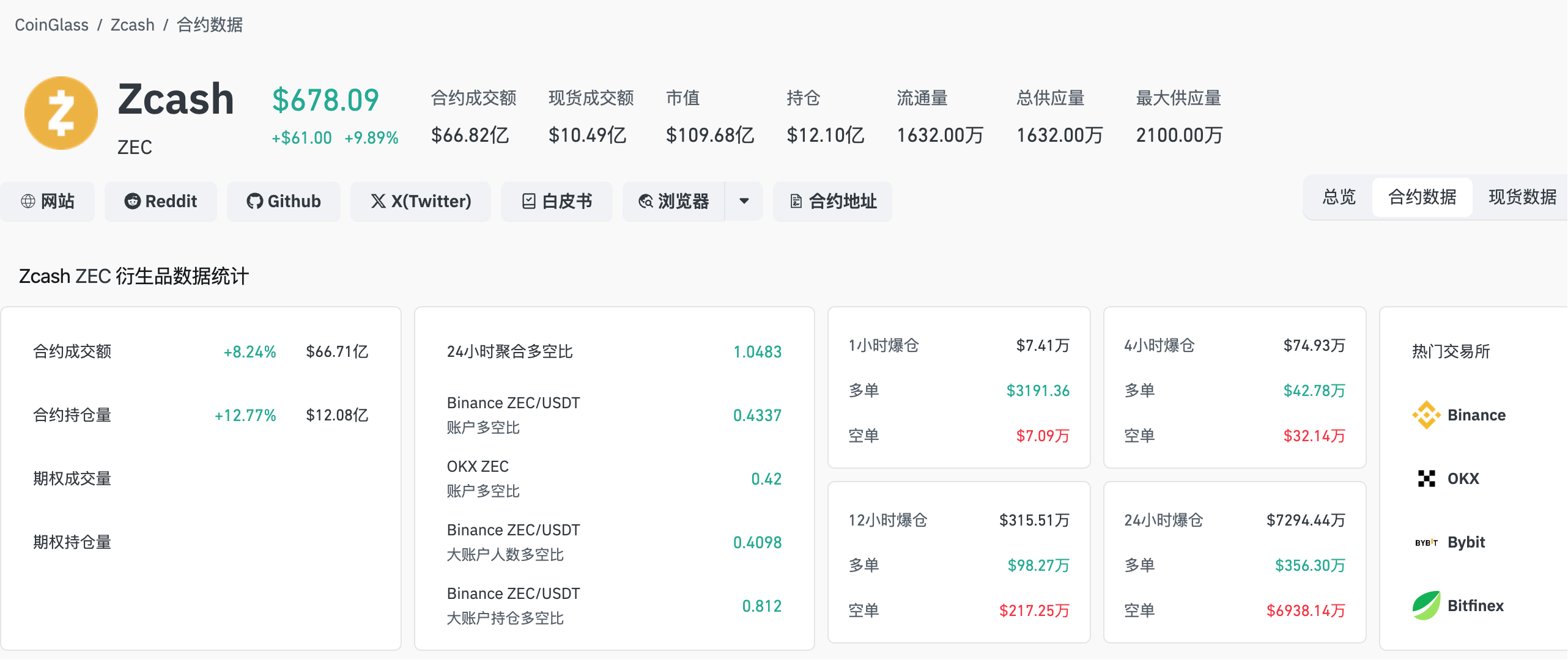 ZEC는 선물 계약에서 가장 집중된 보유 자산이 되었습니다. 24시간 거래량은 BTC와 ETH에 이어 두 번째로 많습니다.