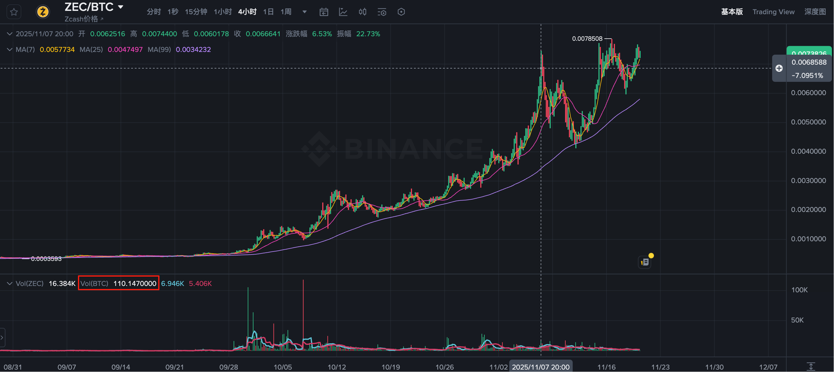 첫째, 11월 7일 이전까지 BTC의 전체 거래량은 점진적인 상승세를 보였습니다. ZEC 가격이 당일 700달러를 돌파한 후, BTC 거래쌍의 거래량은 한때 110개를 넘어섰습니다. 당시 ZEC 전체 매수 거래량에는 BTC로 ZEC를 매수하고 매도하는 거래가 여전히 많았습니다.