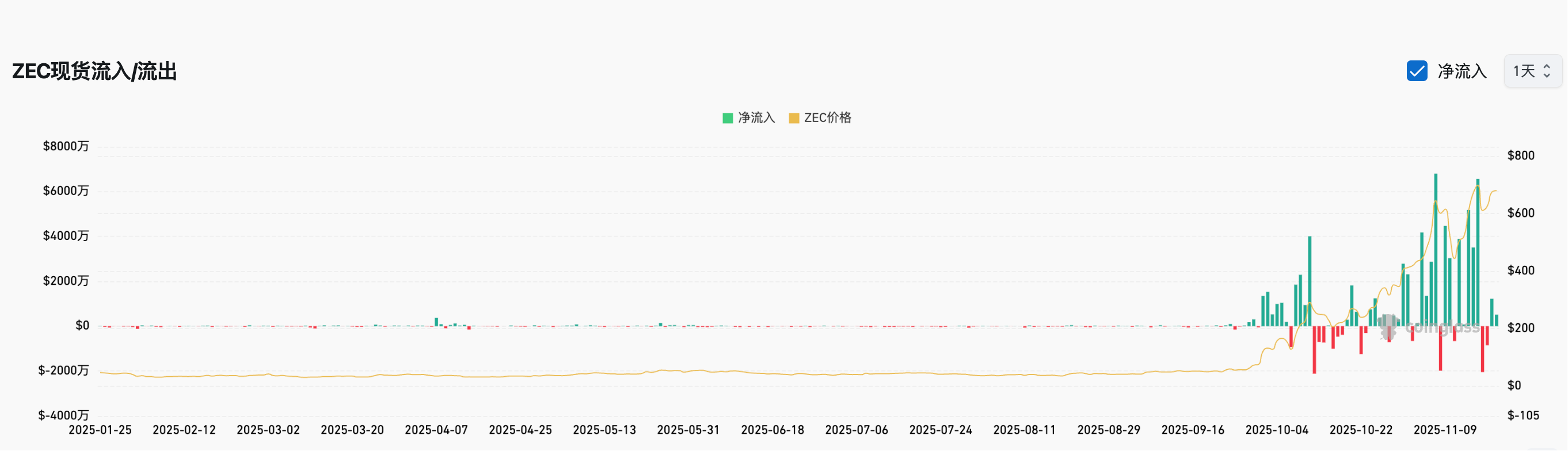 둘째, 11월 7일 이후 ZEC는 하락장에서 몇 안 되는 핫타겟 중 하나가 되었습니다. "천즈 사건", "첸즈민 사건", 그리고 BTC ETF 순유출과 같은 이전 사건들의 영향과 더불어 시장의 관심은 점차 모두가 ZEC를 쫓는 단계로 옮겨갔습니다.