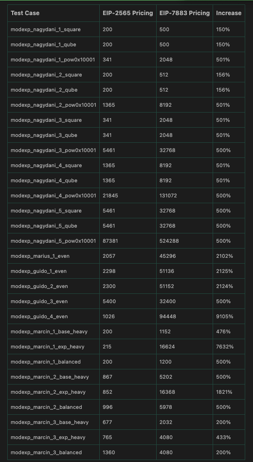 이러한 가격 인상은 ModExp 사전 컴파일 가격이 많은 경우 상당히 저평가되어 있음을 보여주는 벤치마킹 테스트에 따른 것입니다. 개정된 공식은 소규모 작업의 경우 가스 비용을 150%, 일반적인 작업의 경우 약 200%, 그리고 대규모 또는 불균형 작업의 경우 지수, 기저 또는 모듈러스의 크기에 따라 가스 비용을 몇 배, 때로는 80배 이상 증가시킵니다 .