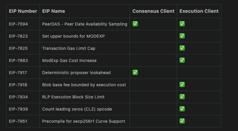 아래 표는 Fusaka EIP별로 어떤 이더리움 클라이언트가 변경이 필요한지 요약한 것입니다. "합의 클라이언트" 아래에 체크 표시가 있으면 EIP의 합의 계층 클라이언트를 업데이트해야 함을 나타내고, "실행 클라이언트" 아래에 체크 표시가 있으면 업그레이드가 실행 계층 클라이언트에 영향을 미침을 나타냅니다. 일부 EIP는 합의 계층과 실행 계층 모두 업데이트가 필요하지만, 어떤 EIP는 둘 중 하나만 업데이트하면 됩니다.