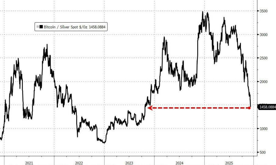 비트코인의 구매력이 감소했습니다. 1년 전 비트코인 1개로 은 3,500온스를 살 수 있었지만, 지금은 같은 비트코인 1개로 은 1,450온스만 살 수 있는데, 이는 2023년 10월 이후 최저치입니다. 이 비율의 급격한 하락은 은과 같은 전통적인 안전 자산에 비해 암호화폐 자산이 약하다는 것을 직접적으로 반영합니다.