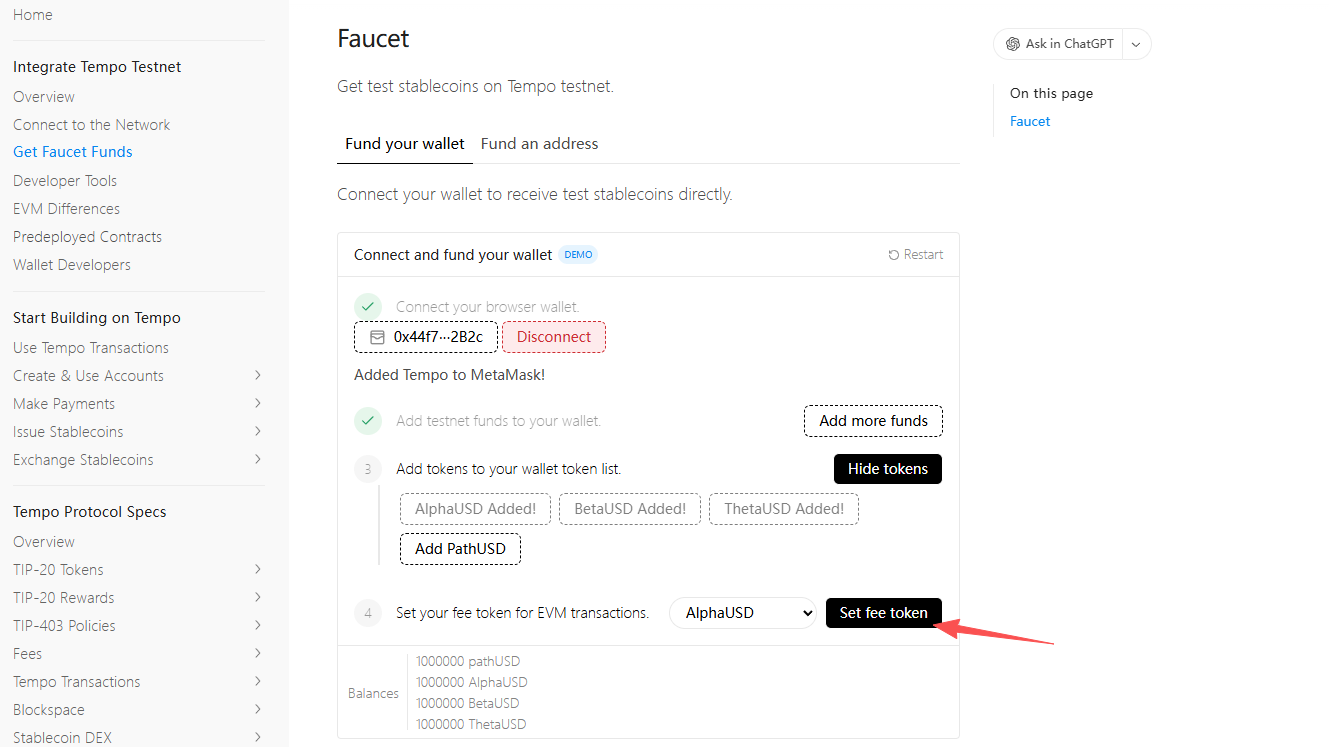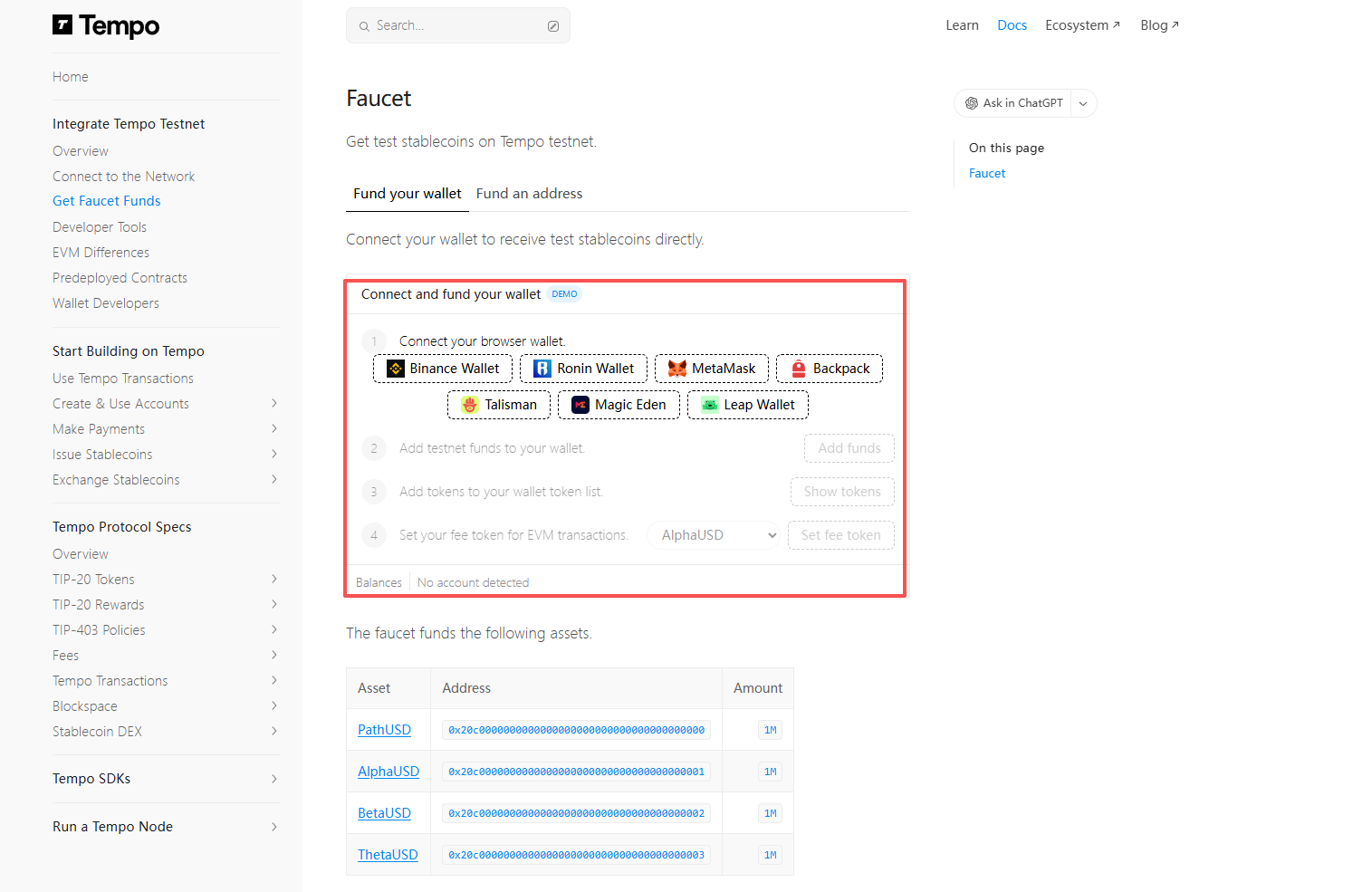 1단계. 공식 문서(링크: https://docs.tempo.xyz/quickstart/faucet )로 이동하여 "Web3 지갑 연결"을 클릭한 다음, Tempo 테스트넷을 지갑 네트워크에 추가하세요.