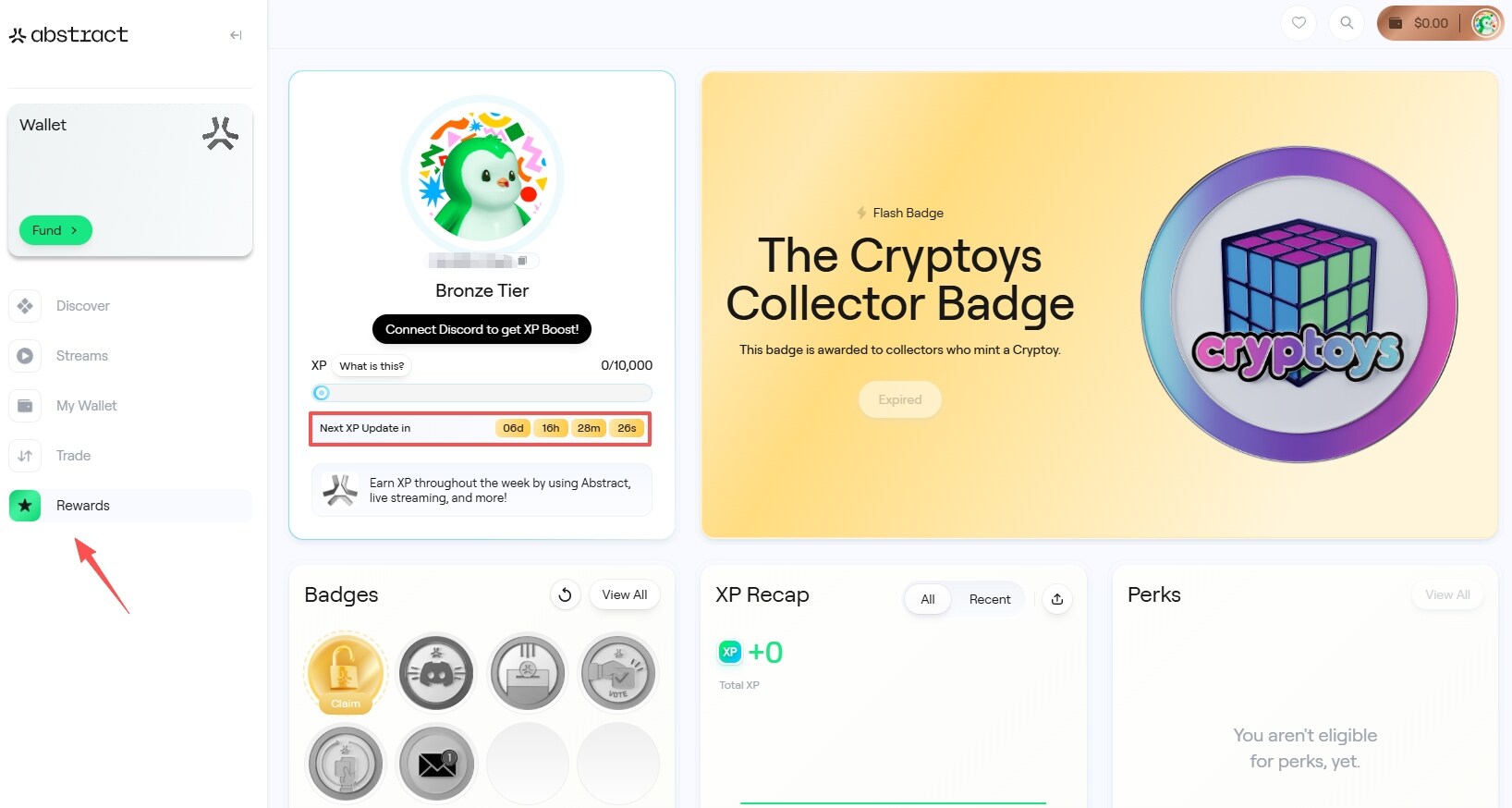 상호작용 웹사이트 링크: https://portal.abs.xyz/rewards, 정기적으로 XP 임무가 업데이트되며, 안내에 따라 XP 포인트 및 배지를 획득할 수 있습니다(아래 그림은 새 계정).