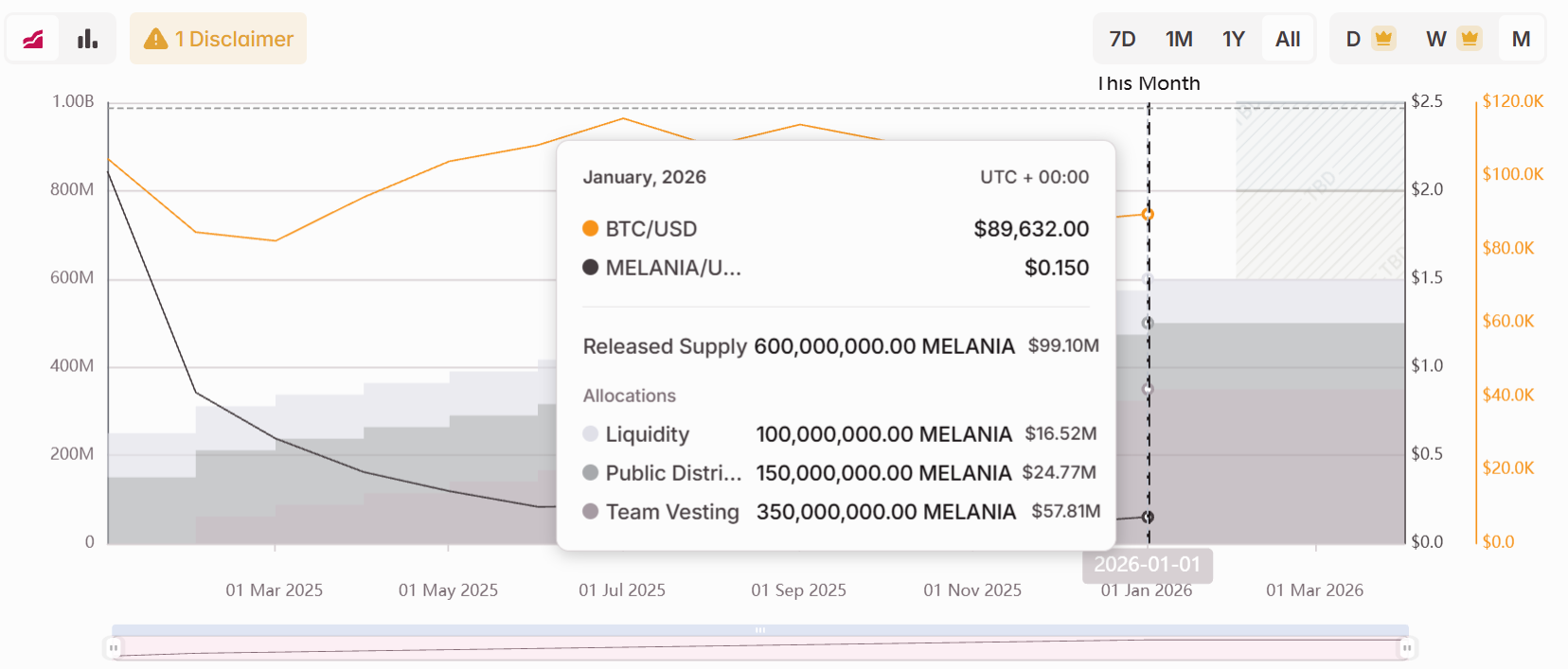MELANIA는 영부인 멜라니아가 소유한 플로리다 등록 회사 MKT World LLC가 마케팅을 담당합니다. 총량 역시 10억 개이며, 현재 약 6억 개가 잠금 해제되었고, 그중 팀 지분은 3억 5000만 개로, 현재 가격으로 약 5780만 달러에 해당합니다.
