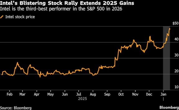 2025년 4분기 - 2026년 1분기 INTC 주가 흐름 (출처: Yahoo Finance / TradingView)