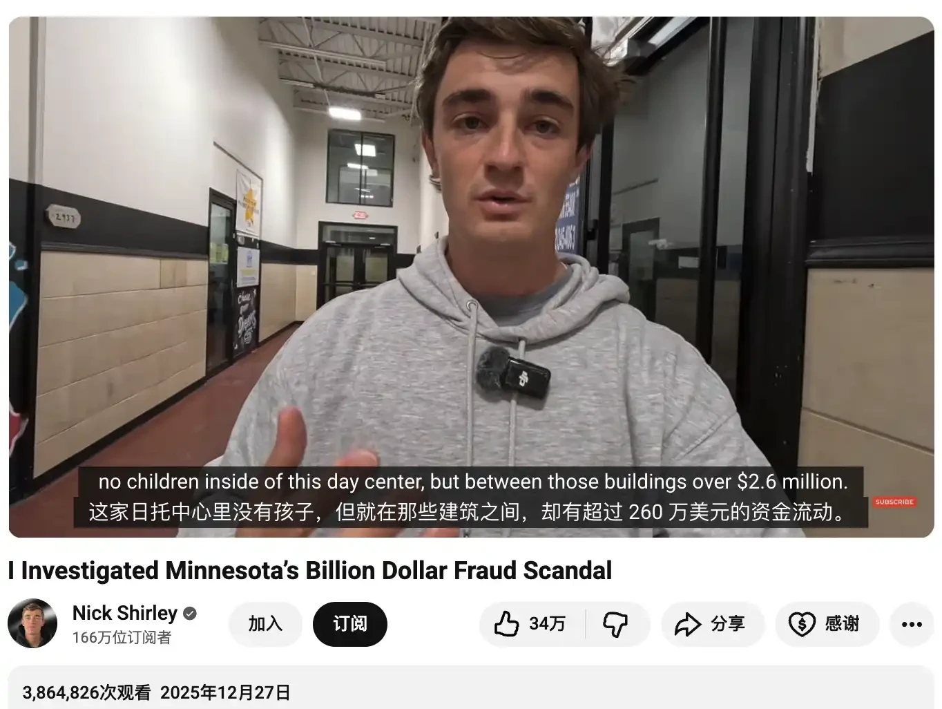 2025년 12월, Nick Shirley는 42분짜리 수사 영상 '일약 스타가 되다'를 게시했습니다. 그는 영상에서 '아동 영양', '취약 계층 지원'이라는 깃발을 내건 일련의 비영리 단체들을 폭로했는데, 이 단체들은 주 정부와 연방 정부에 자금을 신청했으며, 장부상으로는 수천 수만 명의 서비스 대상이 있는 것처럼 보였지만, 실제로는 많은 아이들이 존재하지 않았고, 아동 식사도 존재하지 않았으며, 소위 공익 프로젝트는 재정 지원금을 편취하기 위한 껍데기에 불과했습니다.