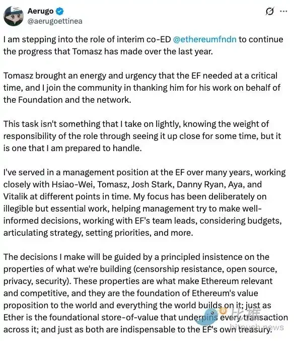 그의 뒤를 이을 사람은 Bastian Aue입니다. 이 사람의 공개 자료는 극히 적으며, X 계정은 등록된 지 8개월밖에 되지 않았고 거의 발언 기록이 없습니다. 그는 Hsiao-Wei Wang과 함께 이더리움 생태계의 핵심 자원과 방향을 장악하는 이 조직을 계속 공동으로 이끌게 될 것입니다.