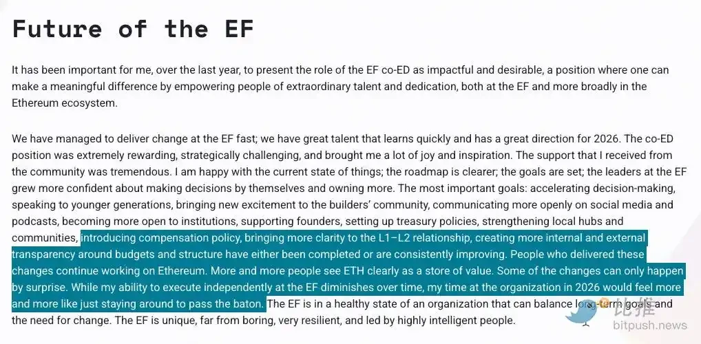 첫째, 그는 이더리움 재단과 전체 생태계가 '건강한 상태'에 있다고 생각합니다. 이제 바통을 넘겨줄 때가 되었습니다.