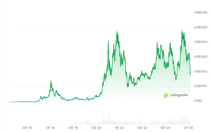 환산해 보면 더 가슴 아픕니다: 2018년 1월, ETH가 처음으로 1400달러를 돌파했습니다. 그 1400달러를 미국 CPI 인플레이션 복리로 조정하면, 2026년 2월 현재 약 1806달러에 해당합니다.