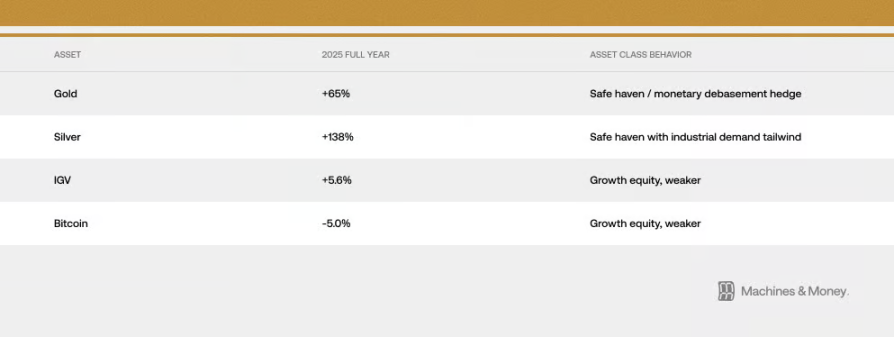 물론 이것이 비트코인이 앞으로 절대 안전자산이 될 수 없다는 뜻은 아니다. 단지 현재 시점에서, 기존의 투자자 구조, 시장 상태, 유동성 환경을 고려할 때, 그것은 아직 그 역할을 하지 못하고 있다는 것이다. 2025년에 비트코인과 소프트웨어 주식은 모두 미미한 한 자릿수 수익률만을 가져다준 반면, 전통적인 실물 자산은 놀라운 성과를 보였다. 이번 대시험에서 비트코인과 테크 성장주는 매우 일관된 행동을 보여주었으며, 이는 '둘이 수렴하고 있다'는 관점의 가장 강력한 증거 중 하나이다.