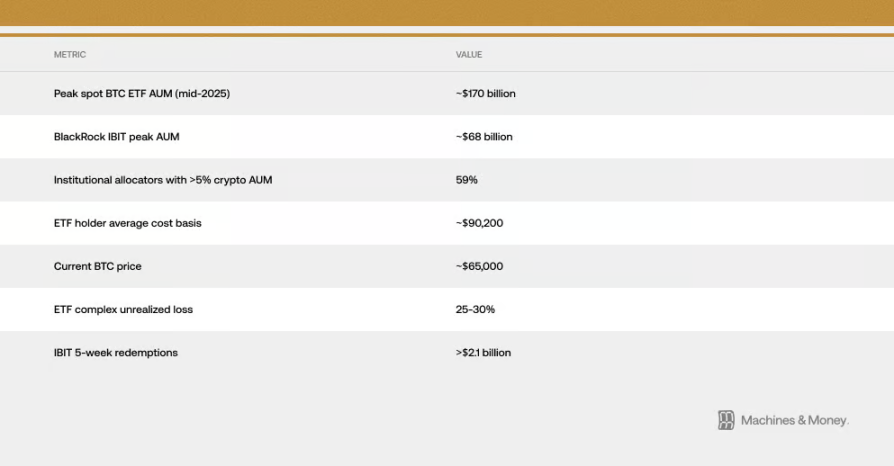 이는 자기 강화 순환을 형성한다: 기관이 비트코인을 테크 주식으로 분류하기 때문에, 그 자금 흐름은 테크 주식과 동기화된다; 그리고 이러한 동기화는 다시 기관의 테크 주식 분류를 강화한다. 추정에 따르면, 미국 현물 비트코인 ETF 보유자의 평균 매입 단가는 약 9만 달러 수준으로, 이는 현재 가격이 6만 4천 달러 근처까지 하락하면서 전체 ETF 내 기관 자금이 25%에서 30%의 평가 손실을 보고 있음을 의미한다. 이 비용 격차는 중요하다. 왜냐하면 원래 장기 보유했을 수도 있는 기관 자금을 지속적인 매도 압력으로 전환시켰기 때문이다. ETF가 위험 분산이나 헤지 수단이 될 것이라고 생각했던 사람들은 이제 금 ETF는 상승하는 동안 자신들의 자산은 계속 손실을 보고 있는 것을 지켜보고 있다. 2026년 초부터 우리는 이러한 ETF 상환과 비트코인 가격 하락의 연쇄 반응을 실시간으로 목격해왔으며, 자금 유출 기간은 ETF 상장 이후 최장 기록을 세웠다. 블랙록의 IBIT 단일 펀드만 해도 최근 5주 동안 21억 달러 이상이 유출되었다.